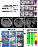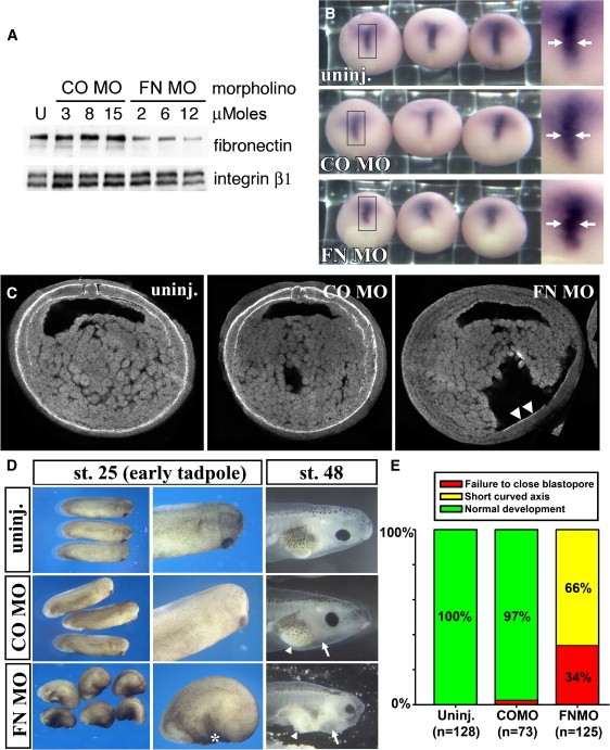 Figure 1. FN Antisense Morpholino âKnocks downâ FN Protein Synthesis, Reduces Fibril Formation, and Reduces Dorsal Axis Extension(A) Western blot analysis of morpholino (MO)-injected embryos harvested at stage 10.5 and processed for detection with the anti-FN mAb 4H2 and the anti-integrin β1 PcAb 363. The two FN bands correspond to two major alternatively spliced FN subunits expressed during development. The control MO has no affect on the levels of expression of either FN or integrin β1 at up to 15 μMoles MO injected per embryo. A dose-dependent reduction in FN protein expression is noted in the presence of the combined (50:50) FNMOs. Levels of integrin β1 protein expression are unaffected by the FN antisense MO.(B) Expression of chordin, a marker of dorsal axial tissues, shows that embryos injected with 15 μMoles FNMO have wide dorsal axial tissues. (Arrows mark the width of the chordin expression.)(C) Transverse confocal sections of embryos stained for FN fibrils show a typical pattern in both control morpholino and uninjected control embryos while fibril formation is almost completely abolished (see arrowheads for an example of faint labeling of blastocoel roof ectoderm in FNMO-injected embryos).(D) FNMO-injected embryos show defects in both dorsal and ventral elongation by early tadpole stages and severe anterior mesoderm defects by later tadpole stages. At early tadpole stages, the dorsal axial extension is moderately reduced while ventral extension is severely reduced (asterisk). Late-stage FNMO-injected tadpoles show defects in ventral mesoderm morphogenesis, ectodermal lesions, and failure of heart (arrow) and gut (arrowheads) formation.(E) Pooled data from three batches of embryos were observed over several days and their progress was assessed. None of the embryos injected with 15 μMoles FNMO develop beating hearts. |