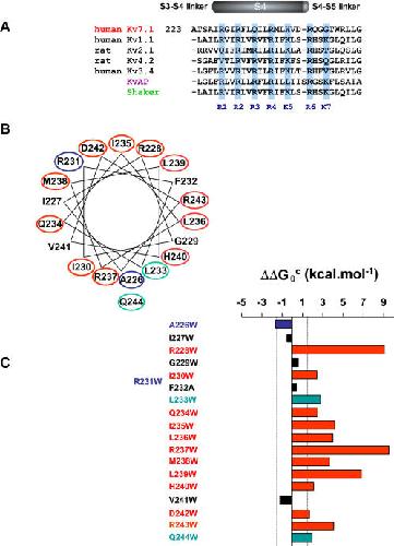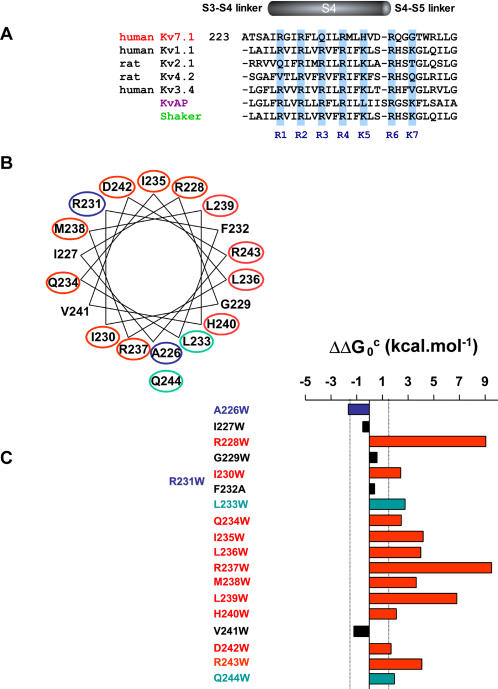 Figure 1. Summary of the tryptophan scan of Kv7.1 S4.(A) Sequence alignment of the S4 segment of human Kv7.1 with various Kv channels. (B) Impact of the perturbations projected onto a helical wheel diagram. The cut-off for significance was ∥ΔΔG0c∥≥1.5 kcal.mol−1. The red, blue and green circled mutated residues shift the gating equilibrium in favor of the closed, open and inactivated state, respectively. (C) Impact of the perturbations expressed as a bar graph along the S4 sequence. The color coding is as in B. The black bars correspond to residues whose perturbation is not significant (∥ΔΔG0c∥<1.5 kcal.mol−1).