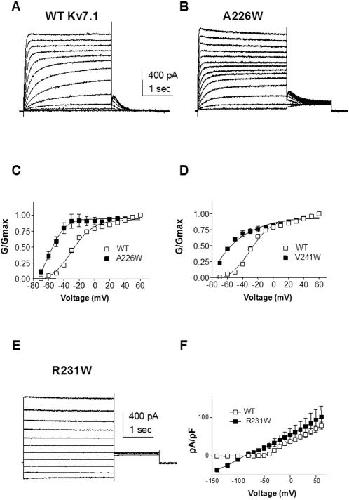 Figure 2. Mutations stabilizing Kv7.1 to the open state.(A) and (B) Representative current traces of WT and A226W, respectively. From a holding potential of −90 mV, the membrane was stepped for 3 s from −70 mV to +60 mV in 10 mV increments and then repolarized for 1.5 s to −60 mV to generate the tail currents. (C) and (D) Normalized conductance was plotted as a function of step voltages, for the mutants (black squares) A226W (n = 6) and V241W (n = 11), respectively, and compared to WT (n = 20) (open squares). The activation curves were fitted using one Boltzmann function. (E) Representative current traces of R231W. Membrane was stepped for 3 s from −140 mV to +60 mV in 20 mV increments and then repolarized for 1.5 s to −60 mV. (F) Current-voltage relations of R231W (n = 8) (black squares) and WT (open squares). Current density (pA/pF) was plotted as a function of step voltages.