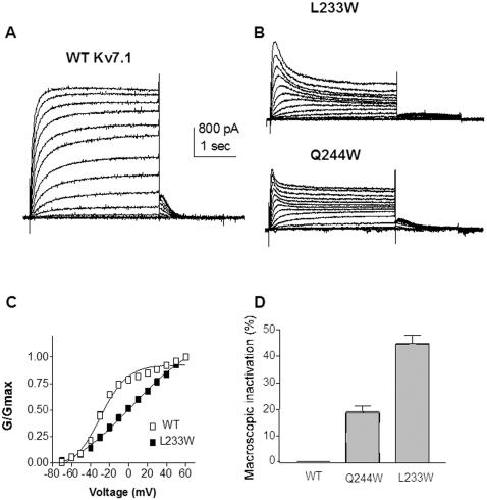 Figure 4. Mutations stabilizing KCNQ1 towards the inactivated state.(A) and (B) Representative current traces of WT and L233W and Q244W, respectively, recorded as in Figure 2 A. (C) Normalized conductance of L233W (n = 13) (black squares), compared to WT (open squares). (D) Percent of macroscopic inactivation of WT, Q244W and L233W (n = 7–20) as measured by the ratio between the sustained and the peak current amplitudes.