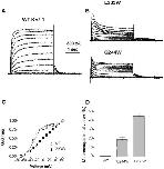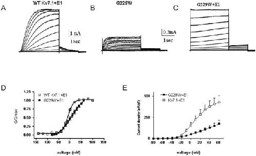 Figure 6. Effect of KCNE1 co-expression with mutant G229W.Representative current traces of WT IKS (A) and mutant G229W expressed without (B) or with KCNE1 (C). From a holding potential of −90 mV, the membrane was stepped for 3 s from −70 mV to +60 mV in 10 mV increments and then repolarized for 1.5 s to −60 mV to generate the tail currents. Conductance-voltage relations (D) and current-voltage relations (E) of WT Kv7.1 and mutant G229W co-expressed with KCNE1.