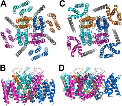 Figure 10. Models corresponding to the three-dimensional structure of Kv1.7 K+ channel and its auxiliary subunit KCNE1.(A) and (B), the closed state in top and side views, respectively. (C) and (D), the open state in top and side views, respectively. Ribbon diagrams of four differently colored identical subunits with the membrane embedded helical segment of KCNE1 in grey.