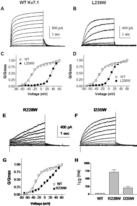 Figure 3. Mutations stabilizing Kv7.1 to the closed state.(A) and (B) Representative current traces of WT and L239W, respectively, recorded as in Figure 2 A. (C) and (D) Normalized conductance of the mutants (black squares) L239W (n = 5) and L236W (n = 10), respectively, compared to WT (open squares). (E) and (F) Representative current traces of R228W and I235W, respectively, recorded as in Figure 2 A. (G) Normalized conductance of R228W (n = 8) (black squares), compared to WT (open squares). (H) The time t1/2 needed to reach half-maximal current amplitude was determined for R228W, I235W and WT (n = 8–20).
