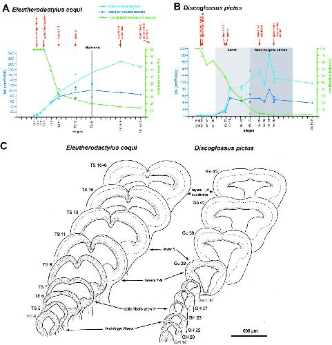 BACKGROUND: Frogs primitively have a biphasic life history with an aquatic larva (tadpole) and a usually terrestrial adult. However, direct developing frogs of the genus Eleutherodactylus have lost a free living larval stage. Many larval structures never form during development of Eleutherodactylus, while limbs, spinal cord, and an adult-like cranial musculoskeletal system develop precociously. RESULTS: Here, I compare growth and differentiation of the retina and tectum and development of early axon tracts in the brain between Eleutherodactylus coqui and the biphasically developing frogs Discoglossus pictus, Physalaemus pustulosus, and Xenopus laevis using morphometry, immunohistochemical detection of proliferating cell nuclear antigen (PCNA) and acetylated tubulin, biocytin tracing, and in situ hybridization for NeuroD. Findings of the present study indicate that retinotectal development was greatly altered during evolution of Eleutherodactlyus mostly due to acceleration of cell proliferation and growth in retina and tectum. However, differentiation of retina, tectum, and fiber tracts in the embryonic brain proceed along a conserved slower schedule and remain temporally coordinated with each other in E. coqui. CONCLUSION: These findings reveal a mosaic pattern of changes in the development of the central nervous system (CNS) during evolution of the direct developing genus Eleutherodactylus. Whereas differentiation events in directly interconnected parts of the CNS such as retina, tectum, and brain tracts remained coordinated presumably due to their interdependent development, they were dissociated from proliferation control and from differentiation events in other parts of the CNS such as the spinal cord. This suggests that mosaic evolutionary changes reflect the modular character of CNS development.