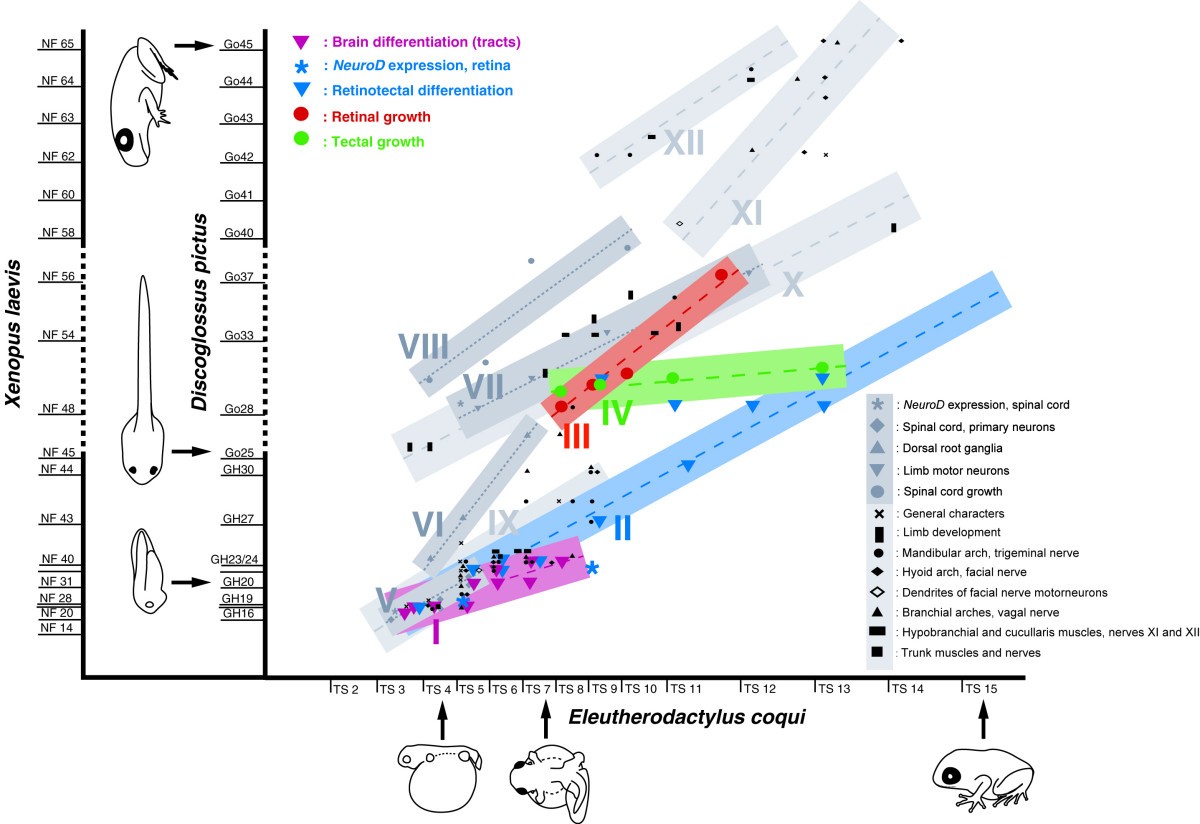 Figure 1. Heterochrony plot comparing the timing of retinotectal and brain development (colored symbols, suites of characters I-IV) with development of the spinal cord (grey symbols, suites of characters V-VIII) and other characters (black symbols, suites of characters IX-XII) in E. coqui and D. pictus (modified, corrected, and supplemented from [28]). X and Y axes represent time axes, along which stages of development are indicated. To facilitate comparisons, the approximate correspondence of stages of D. pictus [86,87] with stages of X. laevis [88]) are also indicated. The duration of the larval period (dashed part of Y axis) in D. pictus and X. laevis is variable and is represented here in a very telescoped fashion. All symbols in the plot except the asterisks represent developmental events (e.g., outgrowth of retinofugal fibers), whose timing in E. coqui is plotted against timing in D. pictus (for detailed list see below). The asterisks compare timing of NeuroD expression between X. laevis and E. coqui. Timing of events is based on data reported in this paper as well as [18,19,21,28,29]; a few data on limb development are taken from [9] and from [93] on D. sardus. For a detailed list of developmental events see Tables 1 and 2 (colored symbols) and references [21,28] (black and grey symbols). Whereas suites of developmental events conserved between two species compared in a heterochrony plot are expected to plot along a diagonal line, temporal dissociations (heterochronic shifts) are indicated by deviations from such a pattern [21]. The distribution of events in this heterochrony plot reveals multiple heterochronic shifts of developmental events between E. coqui and D. pictus. While retinotectal differentiation (blue triangles; suite II) remains temporally coordinated with early development of the CNS (pink triangles; suite I), early differentiation of the spinal cord (grey squares; suite V), and early embryonic development of many cranial structures (black symbols; suite IX) in E. coqui, the formation of lateral motor columns and innervation of the limbs (grey triangles; suite VII) is predisplaced into early embryonic stages paralleling precocious onset of limb development (black symbols; suite X) in E. coqui. The formation of dorsal root ganglia also occurs earlier in E. coqui (grey triangles; suite VI). Growth of the retina (red circles; suite III), the tectum (green circles; suite IV), and the spinal cord (grey circles; suite VIII) all occur relatively early in E. coqui. Metamorphic remodeling of cranial structures (black symbols; suites XI and XII) occurs immediately after embryonic cranial development (black symbols; suite IX) in E. coqui. |