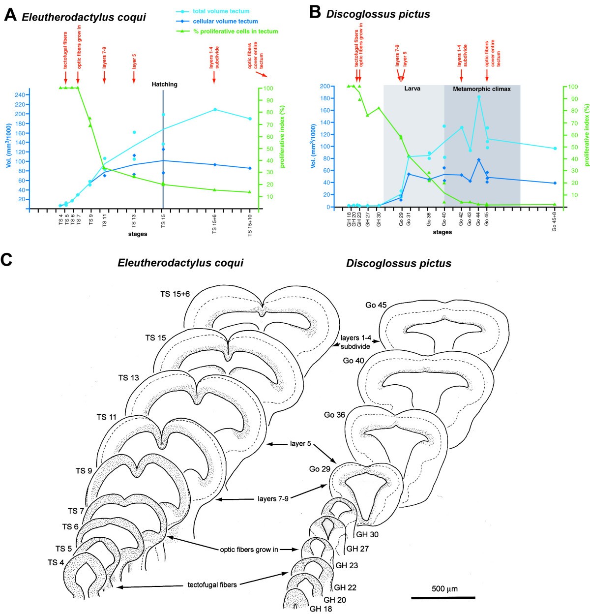 Figure 3. Tectal development in E. coqui and D. pictus. (A, B) Morphometric analysis of tectal development. Volume of the entire optic tectum (light blue) or of its cellular layer (dark blue) is plotted against developmental age. In addition, a proliferative index indicating the PCNA positive proportion of the cellular layer is shown in green. Each symbol represents a measurement from a single individual (there are less data points for the proliferative index than for area measurements because PCNA staining was not apparent in each individual). Curves are drawn through mean values in case more than one individual per stage was analyzed. For each species, timing of first outgrowth of tectofugal fibers, first ingrowth of optic (retinofugal) fibers into the tectum, the formation of tectal layers 7�9, 5, and 1�4, and the coverage of the entire surface of the tectum by optic fibers is indicated in red. Phases of development are depicted as described in Fig. 2. (C) Overview of tectal development in E. coqui and D. pictus based on camera lucida drawings of sections through the central tectum of different developmental stages. Hatched line indicates border between cellular layers adjacent to the ventricle and peripheral fiber layers. Within the tectum, the hatched line indicates border between layers 1�6 (mostly cellular) and layers 7�9 (mostly fibers). Stippling indicates PCNA-positive regions. |