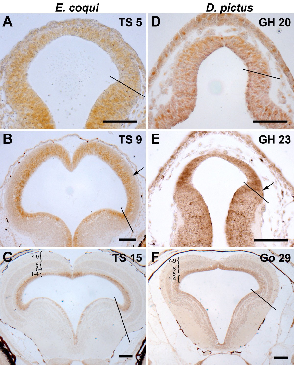 Figure 4. Cell proliferation during tectal development in E. coqui (A-C) and D. pictus (D-F) as revealed by immunostaining for proliferating cell nuclear antigen (PCNA) in transverse paraffine sections. The border of the optic tectum is indicated on the right side of each panel. Tectal layers are identified by numbers in panels C and F. At early embryonic stages of both species (A, D), the optic tectum is very small and all tectal cells are PCNA immunoreactive (orange or brown nuclei). At later embryonic stages (B, E), the tectum of E. coqui has enormously grown in size, while the tectum of D. pictus is still small (note different magnification). While the entire ventricular layer remains PCNA immunoreactive, the first non-proliferating cells are evident (arrows). At hatching, the tectum of E. coqui (C) resembles the tectum of D. pictus at an early larval stage (F): tectal layers 5 and 7�9 have differentiated, while PCNA immunopositive cells continue to be present along the entire ventricular surface. Bar: 100 μm in all panels. |