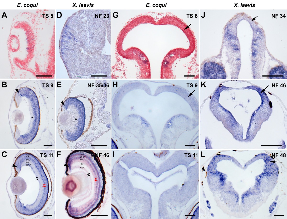 Figure 5. Neurogenesis in the retina and tectum of E. coqui (A-C, G-I) and X. laevis (D-F, J-L) as revealed by in situ hybridization for NeuroD in transverse paraffine sections. A-F: At early embryonic stages, NeuroD begins to be expressed in scattered cells throughout the retina in both species (A, D). Subsequently, most retinal cells express NeuroD, until NeuroD is downregulated in the central, inner part of the retina (asterisks) at midembryonic stages of both species (B, E). The retina of E. coqui has grown to much larger size at this stage than the retina of X. laevis (note different magnification). At later stages, NeuroD expression is restricted to the ciliary margin (arrowheads), the outer part of the inner nuclear layer and the outer nuclear layer in both species (C,F) and to scattered cells in the retinal ganglion cell layer in E. coqui. The inner and outer plexiform layers (black and red arrows, respectively) are much thinner in E. coqui than in X. laevis. G-L: In contrast to X. laevis (J-L), in which the tectum (arrows) expresses NeuroD from stage NF 46 on, the tectum of E. coqui never shows strong NeuroD expression at any stage (G-I) although expression is evident in other parts of the midbrain similar to X. laevis (asterisks). Abbreviations: INL: inner nuclear layer; IPL: inner plexiform layer; ONL: outer nuclear layer; OPL: outer plexiform layer; PR: layer of photoreceptor outer segments; RGC: retinal ganglion cell layer. Bar: 100 μm in all panels. |