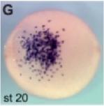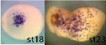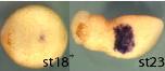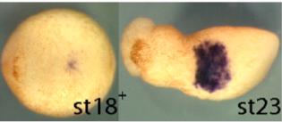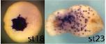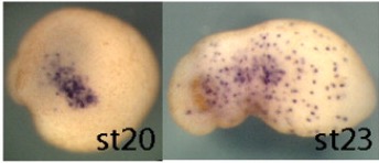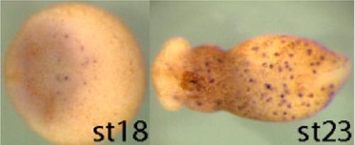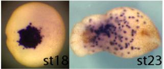 sbi1 (Spi-1 proto-oncogene) gene expression in Xenopus tropicalis embryo, assayed via in situ hybridization, NF stage 20 ( left) and NF stage 23 (right), ventral view, anterior left.