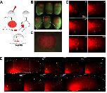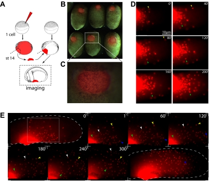 Figure 2. Primitive myeloid migration time-lapse video microscopy. (A) Experimental setup, stage-14 to -16 anterior ventral blood islands were transplanted from microruby-injected to noninjected embryos. Transplanted cells become migratory and leave the transplant to colonize the embryo in 4 to 8 hours. Throughout this period, primitive myeloid cells show different behaviors (Videos S1âS3). (B,C) Stage-18 brightfield/fluorescent composite of transplanted embryos. (D,E) Stills from supplementary movies. (Panel D and Video S2) Ventral view of primitive myeloid cells leaving the transplanted aVBI with âblebbingâ behavior and low migratory speeds. (Panel E and Video S3) Primitive myeloid cells leaving the transplanted aVBI (stage 26, lateral view). At this stage, cells acquire elongated cell morphology and higher motility. Large dashed line shows the embryo contour, and the light dashed square shows the enlarged region shown in still frames. Colored arrowheads point and track the same cell. (D,E) Anterior view is shown to the left; dorsal, to the top. Time is shown in minutes. Images in panels B and C were obtained on a fluorescence stereoscope Leica MZ FLIII (Wetzlar, Germany) attached to a Sony CCD camera DXC-950 image capture system controlled by Northern Eclipse software 7.0 (Empix Imaging, Mississauga, ON). For panels D and E, the same image capture system was attached to an Olympus IX70 inverted fluorescent microscope; 0.1Ã MMR was used as imaging medium. (D) Total magnification 300Ã objective (Olympus LCPlan 20Ã/0.4 NA). (E) Total magnification 40Ã objective (Olympus UPlanFL 4Ã/0.13 NA). Photoshop CS2 (Adobe Systems, San Jose, CA) or ImageJ 1.38 (National Institutes of Health, Bethesda, MD) were used for image or time-lapse video processing. |
