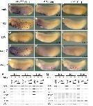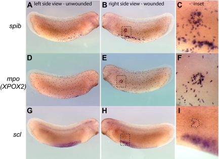 Figure 3. Recruitment of primitive myeloid cells to embryonic wound sites in Xenopus laevis. spib (A-C), mpo (XPOX2) (D,E), and scl (G-I) whole mount in situ hybridization in wounded embryos. Three hours is sufficient for the recruitment of myeloid cells expressing spib or mpo to the scrape wound outline (dashed line contour in the inset). scl-expressing cells are not recruited to the wound site, and primitive myeloid cell recruitment occurs before the appearance of a fully functional vascular network. |