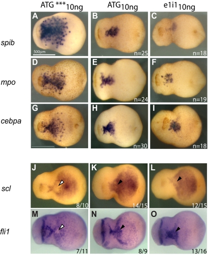 Figure 7. Analysis of migratory potential and hemangioblast-like characteristics of primitive myeloid progenitors in spib-depleted embryos. Migration away from the aVBI is the first morphologic sign of primitive myeloid differentiation and is absent in spib-depleted embryos. (A-I) In spib-depleted embryos, we never observed isolated cells far from the aVBI expressing spib, mpo, and cebpa at a time when migration should have already set in. Usual down-regulation of scl and fli (â¿, J,M) is eliminated in spib morphants (â¼, K,L and N,O). The scl+fli+ hemangioblast-like characteristics are maintained for longer in a small subset of spib-depleted aVBI tissue. |