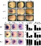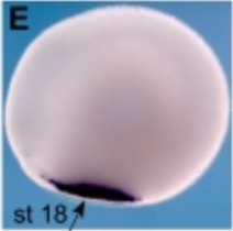 Figure 4. Xenopus tropicalis primitive myeloid marker expression analysis by RT-PCR and WMISH. (A-F) spib, spi1, cebpa, mpo, mmp7, and globin single embryo qRT-PCR and ventral views of WMISH at stages 18 and 23. Among the transcription factors, (A) spib is the first to be specifically expressed in primitive myeloid cells, (B) followed by spi1. (C) Earlier expression of cebpa is due to its broad mesodermal expression before its restriction to the aVBI. (D) mpo is a neutrophil marker; (E) mmp7, a macrophage marker; and (F) globin, a erythroid marker. Error bars represent the SD of at least 3 independent experiments. |
