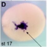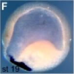 mmp7 (matrix metallopeptidase 7) gene expression in X. tropicalis embryos, assayed via in situ hybridization, at NF stage 18 (left) and NF stage 23 (right), ventral view, anterior left. |