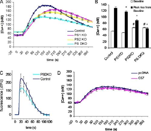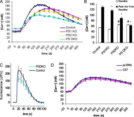 Figure 1. Elevated cytosolic Ca2+ and reduced ER Ca2+ stores in presenilin-null cell line. (A) Changes in cytosolic Ca2+ evoked by thapsigargin in control fibroblasts (control; n = 48 cells) and fibroblasts from PSDKO (n = 57 cells), PS1KO (n = 48), and PS2KO (n = 56) mice. ER Ca2+ stores were released into the cytosol by application of 1 μM thapsigargin, a specific blocker of SERCA activity, with 0 mM Ca2+ in the bathing solution. Basal cytosolic Ca2+ levels were elevated (∼70 nM) in the PSDKO and PS2KO fibroblasts compared with controls and PS1KO cells (∼50 nM; P < 0.05), whereas the peak Ca2+ signals after application of thapsigargin were substantially reduced in PSDKO and PS2KO fibroblasts. (B) Mean values of basal cytosolic [Ca2+] and thapsigargin-evoked Ca2+ signals, derived from the experiments in A. *, significance in peak rise versus pcDNA (P < 0.05); #, significance in basal levels versus pcDNA (P < 0.05). (C) Changes in cytosolic Ca2+ evoked by 1 μM ionomycin in control fibroblasts (control; n = 12 cells) and fibroblasts from PSDKO mice (n = 37 cells), with 0 mM Ca2+ in the bathing solution. (D) Cytosolic Ca2+ signals in PSDKO fibroblasts transfected either with pcDNA (n = 63 cells) or AICD (n = 54 cells) 48 h earlier. No significant differences were apparent in either basal cytosolic Ca2+ levels or the peak response after application of 1 μM thapsigargin. Error bars show SEM. |