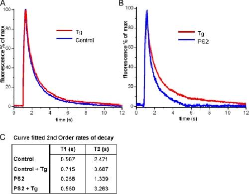 Figure 4. Thapsigargin-sensitive cytosolic Ca2+ sequestration is bigger in PS2-expressing oocytes as compared with control oocytes. (A) Traces show Ca2+-dependent fluorescent signals obtained in control and PS2-expressing oocytes in the absence of (control) and during application of 30 μM thapsigargin (Tg) in the bathing solution. (B) Comparison of thapsigargin-sensitive component of cytosolic Ca2+ clearance in control oocytes versus PS2-expressing oocytes. Traces were obtained by direct subtraction of records obtained in the presence of 30 μM thapsigargin minus records obtained in the absence of thapsigargin. (C) Table listing fast (T1) and slow (T2) time constants of double-exponential fits to the Ca2+ decay data. |