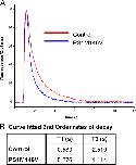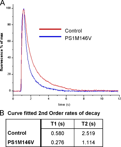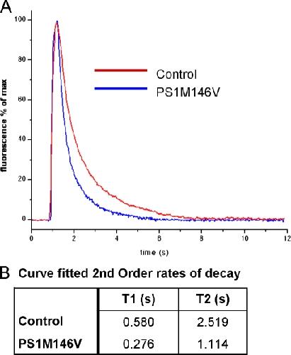 Figure 5. PS1 FAD mutation M146V accelerates cytosolic Ca2+ sequestration. (A) Traces show Ca2+-dependent fluorescence changes (ΔF/Fo) after 300-ms hyperpolarizing pulses to induce Ca2+ entry through nAChR expressed in the plasma membrane obtained from control and PS1 M146V expressing oocytes. (B) Table listing fast (T1) and slow (T2) time constants of double-exponential fits to the Ca2+ decay data. |