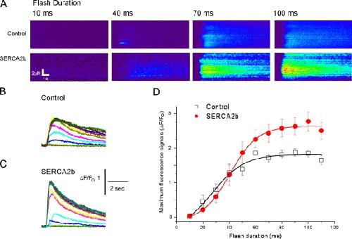 Figure 6. Overexpression of SERCA2b phenocopies the enhanced IP3-evoked signals and accelerated Ca2+ decay observed with presenilin overexpression. (A) Representative linescan images showing Ca2+ signals evoked by photolysis flashes of 10-, 40-, 70-, and 100-ms durations. In each panel, distance along the scan line is depicted vertically, time runs from left to right, and increasing fluorescence ratio (increasing Ca2+) corresponds to increasingly “warm” colors. Note the enhanced response in the oocyte overexpressing SERCA2b. (B and C) B and C show, respectively, Ca2+-dependent fluorescence signals evoked by photoreleased IP3 in a control oocyte and an oocyte expressing SERCA2b. In each panel, superimposed traces show responses (fluorescence ratio change averaged across the scan line) evoked by UV light flash durations in 10-ms increments between 10 and 110 ms. (D) Mean peak Ca2+ concentration plotted as a function of flash duration (linearly proportional to IP3) in control oocytes (n = 6) and in oocytes expressing SERCA2b (n = 5) from at least six recordings from multiple oocytes. Error bars show SEM. |