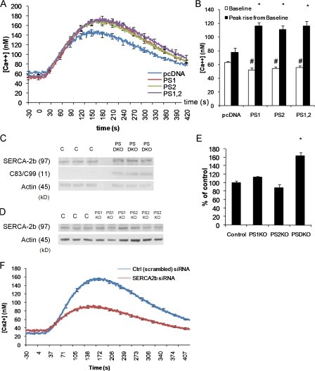 Figure 2. Ca2+ deficits in presenilin-null fibroblasts are not caused by reduced SERCA2b expression. (A) Changes in cytosolic Ca2+ evoked by thapsigargin in PSDKO fibroblasts transfected 48 h earlier with pcDNA (n = 25 cells), PS1 (n = 40 cells), PS2 (n = 48 cells), or both PS1 and 2 (n = 47 cells), with 0 mM Ca2+ in the bathing solution. Basal cytosolic Ca2+ levels were reduced (∼20 nM) in the presenilin-transfected fibroblasts compared with controls, whereas the peak Ca2+ signals after application of thapsigargin were significantly increased in presenilin-transfected fibroblasts. (B) Mean values of basal cytosolic Ca2+ and thapsigargin-evoked Ca2+ signals, derived from the experiments in A. *, significance in peak rise versus pcDNA (P < 0.05); #, significance in basal levels versus pcDNA (P < 0.05). (C) Steady-state levels of SERCA2b protein are higher in PSDKO fibroblasts compared with controls based on Western blotting. The PSDKO fibroblasts also displayed C83–C99 APP fragments that were not present in the controls because of the lack of γ-secretase activity. β-Actin levels are shown as a loading control. (D) Steady-state levels of SERCA2b in PS1KO and PS2KO fibroblasts compared with controls based on Western blotting. (E) Densitometric analysis of the SERCA2b levels in C and D, normalized to β-actin, showing elevation of SERCA2b levels in the PSDKO fibroblasts. *, significance in peak rise versus pcDNA (P < 0.05; n = 3). (F) Genetic down-regulation of SERCA2b expression lowers ER Ca2+ stores and elevates basal Ca2+ levels. siRNA-mediated down-regulation of SERCA2b leads to lower ER Ca2+ stores (*, P < 0.001; n = 105 cells) when compared with cells treated with a control (scrambled) siRNA. Error bars show SEM. |