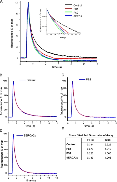 Figure 3. PS1 and PS2 accelerate the clearance of cytosolic Ca2+ after entry via muscle nAChR channels. (A) Ca2+-dependent fluorescence changes (ΔF/Fo) after 300-ms hyperpolarizing pulses to induce Ca2+ entry through nAChR expressed in the plasma membrane. Traces show mean data from >35 recordings in multiple oocytes injected 3 d earlier with αβδγ nAChR subunits alone (control) or together with PS1, PS2, or SERCA2b cRNA. The inset shows the same data on a semilogarithmic scale. (B–D) Data from, respectively, control, PS2, and SERCA2b oocytes, fitted by biexponential decays (superimposed red traces). (E) Table listing fast (T1) and slow (T2) time constants of double-exponential fits to the Ca2+ decay data. |