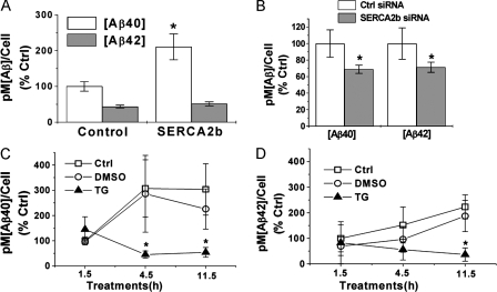 Figure 8. SERCA activity regulates Aβ production. (A) SERCA2b overexpression leads to higher Aβ levels. Aβ40 and Aβ42 levels were measured by sandwich ELISA. Note that Aβ40 levels are significantly increased in SERCA2b-transfected cells, compared with control pcDNA vector-treated cells (*, P < 0.05; n = 5). (B) Genetic down-regulation of SERCA2b expression lowers Aβ levels. siRNA-mediated down-regulation of SERCA2b leads to lower steady-state Aβ levels when compared with cells treated with a control (scrambled) siRNA (*, P < 0.05; n = 6). (C and D) Pharmacological inhibition of SERCA activity lowers steady-state Aβ levels. Inhibition of SERCA2b with 1 μM thapsigargin in the presence of extracellular Ca2+ decreases Aβ40 levels within 4.5 h (n = 4) and also decreases Aβ42 levels within 11.5 h (n = 4). 4.5 h: *, P < 0.005 for thapsigargin and control; *, P < 0.05 for thapsigargin and DMSO. 11.5 h: *, P < 0.005 for thapsigargin and control; *, P < 0.05 for thapsigargin and DMSO. Error bars show SEM. |