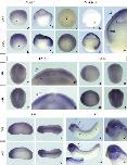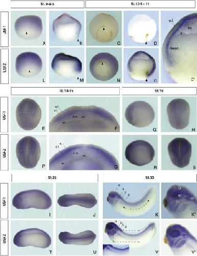 Fig. 3. Expression profiles of Xenopus laevis USF genes during embryonic development. WMISH analysis with digoxigenin-labeled probes was performed to determine the spatial expression patterns of USF genes during development. Stained embryos are shown at six stages as labeled in the figure. In the images of late blastula- (stages 9â9.5) and gastrula-stage (stages 10.5â11) embryos, arrowheads indicate the dorsal lip positions (blastula, initial dorsal lip pigment; gastrula, fine dorsal lip). A higher-magnification view of the gray rectangular region in panel O is shown in panel Oâ² [black dashed line: mesoderm (meso), white dashed line: border of epithelial layer (e.l.) and sensorial layer (s.l.); bc: blastocoel]. White dashed lines in panels E and P indicate the positions of the cuts made to give the cross-sections in panels F and Q. Panels F and Q are WMISH images of cut embryos at stages 14â15 (nc, notochord; e.l., epithelial layer of neuroectoderm; s.l., sensorial layer of neuroectoderm; s.m., somitic mesoderm; en, endoderm). The borders of the three germ layers are indicated at the left side of the embryo as dashed lines. Different views of stage 19 and 25 embryos are shown (H, J, S and U dorsal; G, I, R and T, lateral). Panels K and V are lateral views of late tailbud-stage embryos (stage 33). The dashed line with arrowheads indicates the somite stained with the USF1 probe (panel K). Arrowhead (white) indicates the lateral plate mesoderm stained with the USF2 probe (panel V). Small lines (aâd) in panels K and V point to where the transverse sections of the stage 33 WMISH sample (Fig. 5) were taken. Panels Kâ² and Vâ² are higher-magnification views of the gray boxes in panels K and V (br, brain; ov, otic vesicle; ey, eye; ba, branchial arches). Inset in V is a highly contrasted view of the area indicated by dashed box in panel V (pronephros). |