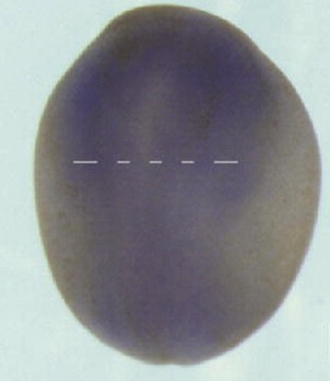 usf1 (upstream transcription factor 1 [provisional]) gene expression in Xenopus laevis embryo via in situ hybridization, NF stage 19, dorsal view, anterior up.