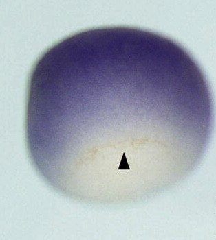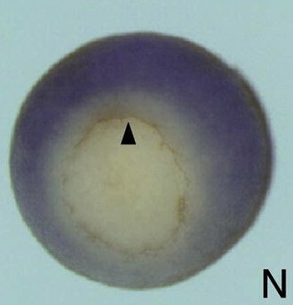 usf2 (upstream transcription factor 2 [provisional]) gene expression in Xenopus laevis embryo via in situ hybridization, NF stage 9, vegetal view, dorsal up. |