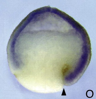 usf2 (upstream transcription factor 2 [provisional]) gene expression in Xenopus laevis embryo via in situ hybridization, NF stage10.5, lateral view, dorsal up, anterior left. |