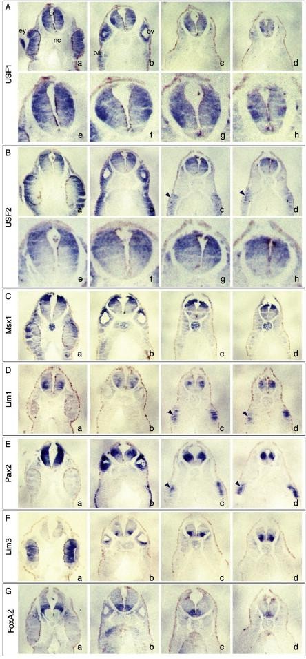 Fig. 5. Expression of Xenopus laevis USF genes in the CNS at the tailbud stage. Sections of embryos stained by WMISH are shown. A and B are images from embryos stained by USF probes (A, USF1; B, USF2). The positions of sections aâd in the embryos are indicated in Fig. 3K and V. Higher-magnification views of the neural tube in panels aâd are shown in panels eâh. CâG are the corresponding sections [from the embryos stained by WMISH with CNS specification markers from dorsal to ventral: C, Msx1 as marker of roof plate ([Liem et al., 1995] and [Schlosser and Ahrens, 2004]); D, Lim1 as alar plate (Taira et al., 1994); E, Pax2 as lateral part of CNS ([Mansouri et al., 1996] and [Heller and Brandli, 1999]); F, Lim3 as basal plate (Taira et al., 1993); G, FoxA2 as floor plate (Lee et al., 1997)]. Arrowheads indicate the pronephros. br, brain; nc, notochord; ov, otic vesicle; ey, eye; ba, branchial arches. |