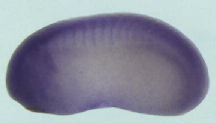 usf1 (upstream transcription factor 1 [provisional]) gene expression in Xenopus laevis embryo via in situ hybridization, NF stage 25, lateral view, anterior left, dorsal up. |