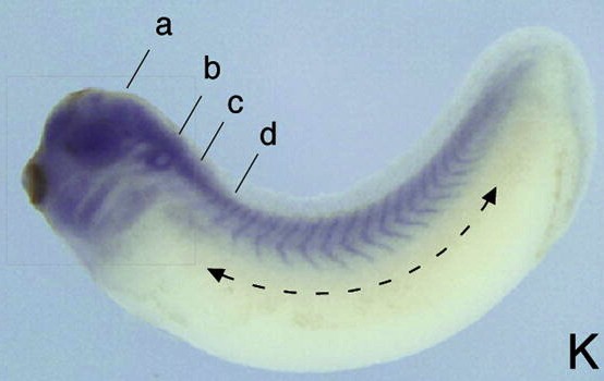 usf1 (upstream transcription factor 1 [provisional]) gene expression in Xenopus laevis embryo via in situ hybridization, NF stage 33, lateral view, anterior left, dorsal up. |