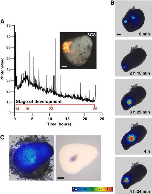 Fig. 5. The expression of XSMP-30 correlates with domains of Ca2+ transients. (A) The pronephric territory was isolated from late gastrula aequorin-injected embryos and cultured in Steinberg's solution until sibling control embryos reached stage 29. A representative example of a PMT trace (n = 7) obtained from an aequorin-loaded explant (integration time 30 s). Light emission, expressed in photons per second and reflecting changes in [Ca2+]i, starts just prior to stage 14. Differentiated pronephric tubules can be visualized with the tubule-specific monoclonal antibody, 3G8 (see inset panel; scale bar is 100 µm). (B) Representative example (n = 3) of the spatial distribution of a sequence of Ca2+ transients that occur over a period of  4.5 h after stage 14. Each aequorin-generated image represents 120 s of accumulated light. These have been superimposed on to the corresponding bright-field images of the explant. Color scale indicates luminescent flux in photons/pixel. Scale bar is 100 µm. (C) Accumulated increase in [Ca2+]i during 6 h of data acquisition, which was superimposed on the bright-field imaged grabbed at the end of acquisition (left panel). In the same explant, the expression pattern of XSMP-30 was determined at stage 34 by in situ hybridization (right panel). The domain of gene expression is located within the domain of high Ca2+ signals. Scale bar 100 µm.