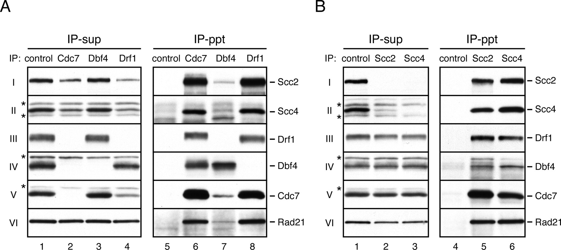 Figure 3. Cdc7-kinase complexes physically associate with Scc2âScc4. (A) IP was performed with control (lanes 1,5), anti-Cdc7 (lanes 2,6), anti-Dbf4 (lanes 3,7), or anti-Drf1 antibody (lanes 4,8) from LSS. Supernatants (IP-sup; lanes 1â4) and immunoprecipitates (IP-ppt; lanes 5â8) were probed with the indicated antibodies. (*) Cross-reacting band. (B) IP was performed with control (lanes 1,4), anti-Scc2 (lanes 2,5), or anti-Scc4 antibody (lanes 3,6) from LSS. Supernatants (IP-sup; lanes 1â3) or immunoprecipitates (IP-ppt; lanes 4â6) were probed with the indicated antibodies. (*) Cross-reacting band. |