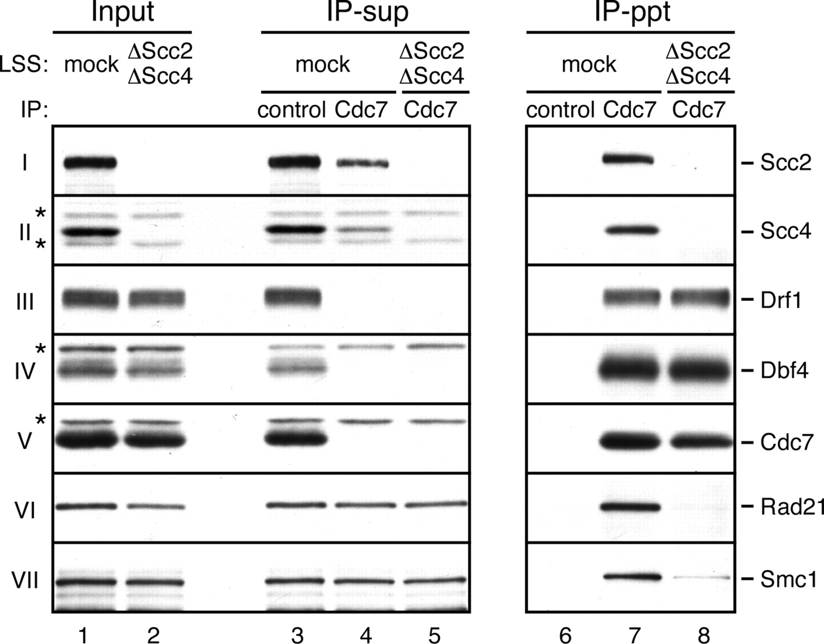 Figure 4. Cdc7 and cohesin associate via Scc2âScc4. LSS was depleted with either control (lanes 1,3,4,6,7) or a mixture of Scc2 and Scc4 antibodies (lanes 2,5,8). IP from the resulting LSS was performed with control (lanes 3,6) or Cdc7 antibody (lanes 4,5,7,8). Input (lanes 1,2), supernatants (IP-sup; lanes 3â5), and immunoprecipitates (IP-ppt; lanes 6â8) were probed with the indicated antibodies. (*) Cross-reacting band. |