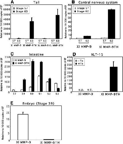 Fig. 4. Quantitative real-time reverse transcriptionâpolymerase chain reaction (RTâPCR) analysis of MMP-9 and MMP-9TH mRNA expression. Total RNA was extracted and subjected to quantitative real-time RTâPCR to determine MMP-9 and MMP-9TH mRNA levels normalized to elongation factor-1α (EF) expression. Real-time RTâPCR was performed using total RNA isolated from tails of stage 57 and 63 tadpoles of Xenopus laevis and Xenopus tropicalis (A), central nervous system of stage 57 and 62 tadpoles (B), intestine of stage 57â63 tadpoles (C), XLT-15 cells cultured in the absence (control) or presence of 10 nm T3 for 20 h (D), and whole embryo of stage 39 (E). Results are the means ± SE of three independent experiments. The levels of MMP-9 and MMP-9TH mRNA are shown as copy numbers relative to 10 000 copies of EF mRNA.