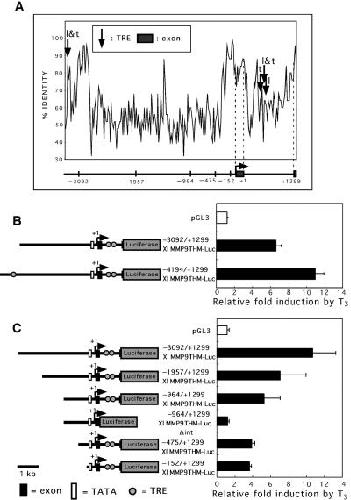 Fig. 6. Transient transfection assays of luciferase expression driven by the Xl MMP-9TH promoter. (A) Sequence comparison of genomic DNA surrounding the promoter in Xl and Xt MMP-9TH genes. The percentage nucleotide sequence identity in every 25 bp is indicated on the diagram. The MMP-9TH gene structure is represented below. The exons are indicated by dark boxes. The numbers show distance from the transcription initiation site (+1). The locations of putative TRE in the promoters of Xenopus laevis and Xenopus tropicalis are indicated with arrows labeled by l and t, respectively. (B,C) XLT-15 cells were transiently co-transfected with 25 ng of the indicated constructs, 12.5 ng of xTRα expression vector, 12.5 ng xRXRα expression vector and 5 ng of pRL-CMV. Two days after transfection, cells were incubated for 24 h in the presence or absence of 10 nm T3. Cells were lyzed, and luciferase assays were conducted. When xTRα and xRXRα expression vectors were removed in transient transfection assays, the induction by T3 decreased to 1.1-fold and 1.2-fold, respectively. Each point was performed in triplicate and repeated at least three times. The data are presented as fold induction by T3. The error bars represent the SE.