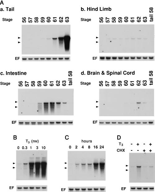 Fig. 2. Expression of the Xl MMP-9TH gene is induced during spontaneous metamorphosis and in a T3-treated XLT-15 cultured cell line. (A) The developmental expression of Xl MMP-9TH mRNA in tail, hindlimb, intestine and central nervous system. A Xl MMP-9TH probe was hybridized to 5 µg of total cellular RNA isolated from tail (a), hindlimb (b), intestine (c) and central nervous system (d) of stage 56â63 tadpoles. These blotting filters contain RNA of stage 58 tail for the comparison. Arrowheads indicate the positions of 18S and 28S rRNA. (B) The T3 doseâresponse of Xl MMP-9TH mRNA upregulation. A Xl MMP-9TH probe was hybridized to 5 µg of total cellular RNA isolated from XLT-15 cells treated with the indicated concentration of T3 for 24 h. (C) The time course of Xl MMP-9TH mRNA upregulation by T3. A Xl MMP-9TH probe was hybridized to 5 µg of total cellular RNA isolated from XLT-15 cells treated with 10 nm T3 for the indicated times. (D) The effect of protein synthesis inhibition on Xl MMP-9TH mRNA upregulation by T3. A Xl MMP-9TH probe was hybridized to 5 µg of total cellular RNA isolated from XLT-15 cells treated with or without 10 nm T3 for 8 h in the presence or absence of a protein synthesis inhibitor, 10 µg/mL cycloheximide. Control hybridization of the blots with the Xenopus laevis elongation factor-1α probe (EF) (Krieg et al. 1989) is shown below to standardize the amounts of RNA.