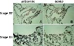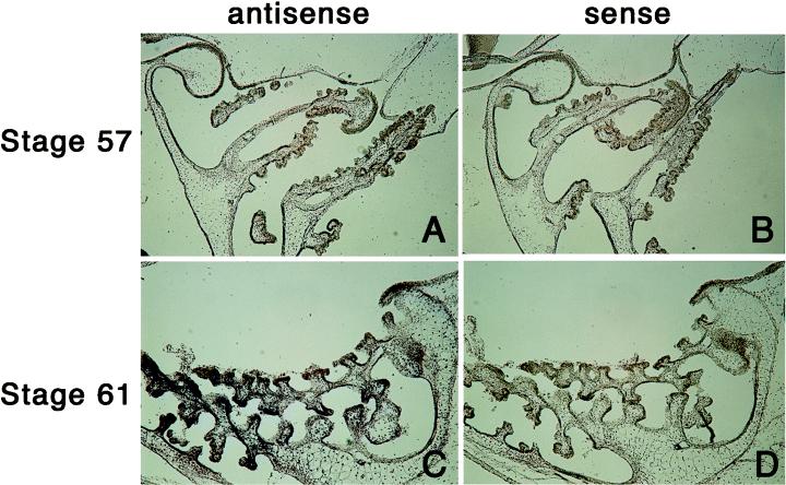 Fig. 3. In situ hybridization of Xl MMP-9TH [ mmp9, matrix metallopeptidase 9] in the branchial arches. Two consecutive cross sections of branchial arches in stage 57 (A,B) and stage 61 (C,D) tadpole were hybridized with antisense (A,C) or sense (B,D) digoxigenin-labeled Xl MMP-9TH probe.