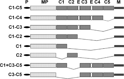used in this study. P, proregion; MP, metalloprotease domain, C1–5, CUB