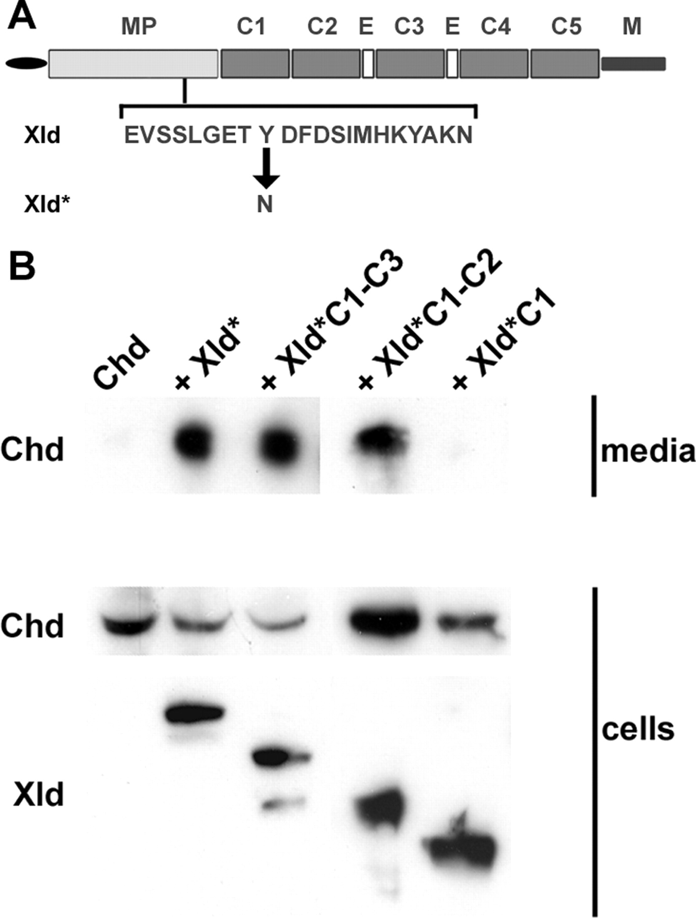 FIGURE 5. CUB1 and CUB2 are required for Xld to cleave Chordin. A, schematic