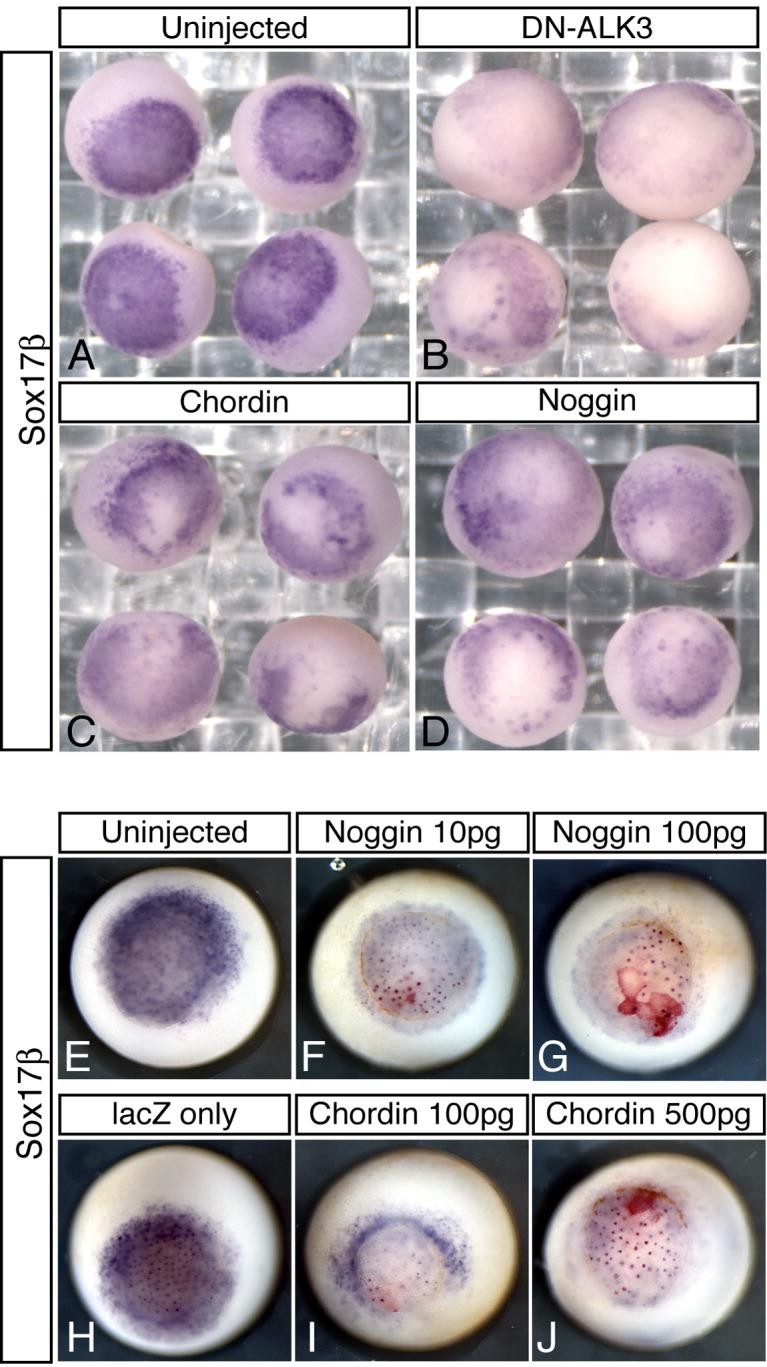 Figure 3. Bmp antagonists disrupt early endoderm formation. One-cell embryos were injected vegetally with mRNA encoding the following Bmp Antagonists. B: DN-Alk3 (0.5 ng). C: Chordin (0.5 ng). D: Noggin (0.5 ng). The embryos were assayed by in situ hybridization with a probe for Sox17 beta at stage 10.5. A: A control injected with water. F-J: Two-cell-stage embryos were injected vegetally with 200 pg of lacZ mRNA, and mRNA for Chordin or Noggin as indicated. Embryos were fixed at stage 11, stained for lacZ using red gal substrate, and analyzed for Sox17 beta expression.
