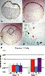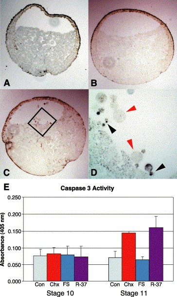 Fig. 2. Inhibition of PDGFR induces apoptosis via the caspase 3 pathway at gastrulation. Nicked DNA, an indicator of apoptosis, is visualized by terminal-UTP-nicked-end labeling (TUNEL). (A) Uninjected embryos treated with DNase I before TUNEL labeling have TUNEL-positive cells around the embryos periphery. (B) PDGFR-FS-injected embryos do not TUNEL-positive mesoderm cells. (C) PDGFR-37-injected embryos have TUNEL-positive cells in the blastocoel cavity. (D) An enlargement TUNEL positive cells within the square in C. Note in the blastocoel, small cells are TUNEL-positive (black arrowheads) and large cells are not (red arrowheads). (E) Caspase 3 activity was assessed at stages 10 and 11. Uninjected embryos (Con), embryos injected with PDGFR-37 (R-37) or PDGFR-FS (FS) mRNA at the 2- to 4-cell stage, embryos treated with 0.1 mg/ml cycloheximide (Chx) at the 32-cell stage. Note caspase 3 activity is increased in PDGFR-37-injected embryos compared to uninjected or PDGFR-FS-injected controls. Error bars represent standard error.