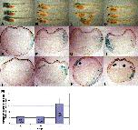 Fig. 3. Over-expression of Bcl-2 in PDGFR-37-injected embryos rescues the cell death but not gastrulation movements of mesoderm cells. Embryos that received mRNAs encoding β-gal-NLS and (A, D) PDGFR-FS, (G) Bcl-2, (B, E, H) PDGFR-37, or (C, F, I) Bcl-2/PDGFR-37 at a 10:1 ratio at the 2- to 4-cell stage were fixed and stained for β-gal at stages (AâC) 11 and (DâI) 26. Note the presence of cells with diffuse β-gal staining in the blastocoel of PDGFR-37-injected embryos (B, arrows; a mild phenotype is shownâsee Fig. 4 for severe PDGFR-37 phenotypes) and their absence in Bcl-2/PDGFR-37-injected embryos (C) at stage 11. Also note the presence of lumps along the dorsal axis of Bcl-2/PDGFR-37-injected embryos at the tailbud stage (F, arrowheads). Gastrula-staged embryos are oriented animal up, dorsoanterior right.