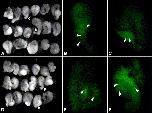 Fig. 5. PDGFR signaling is not required for convergent extension of open-faced Keller explants. Keller explants were dissected at stage 10.25 from embryos co-injected with Gap43-GFP and either PDGFR-FS or PDGFR-37 mRNAs (see Material and methods). The explants were cultured until stage 20. GFP-positive explants were fixed in MEMFA to quench the GFP fluorescence, and subjected to TUNEL staining using dUTP conjugated to fluorescein. (A) PDGFR-FS-injected explants elongate to a similar extent as (D) PDGFR-37-injected explants. (B, C) PDGFR-FS-injected explants contain a similar number of TUNEL-positive, fluorescein-labeled, cells as (E, F) PDGFR-37-injected explants. Examples of TUNEL-positive cells are indicated (arrowheads). The explants from three independent experiments are shown in A and D.
