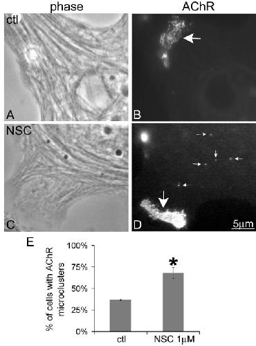 Figure 2. Effect of Shp2 inhibitor NSC-87877 on AChR micro-cluster formation. Cultured Xenopus muscle cells, used here and in all experiments described below, were labeled with R-BTX and then incubated overnight in control culture medium (A, B) or in medium containing 1 μM NSC-87877 (NSC) (C, D). Large pre-patterned AChR clusters, often >10 μm in width, were detected in both control and NSC-treated cells (B, D; large arrows), but in cells exposed to NSC, AChR micro-clusters were also frequently observed (D; small arrows). E. Quantification of pooled data from multiple experiments revealed that AChR micro-clusters developed in nearly twice the number of muscle cells incubated in 1 μM NSC-87877 as those maintained in control medium. Mean and SEM values are shown here and in all following figures; control cells, n = 103; NSC-treated cells, n = 109; t-test *p < 0.005.