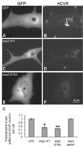 Figure 6. Effects of over-expression of wild-type or constitutively active Shp2 on pre-patterned AChR cluster formation. Wild-type and mutant Shp2 proteins were over-expressed in Xenopus muscle cells by mRNA injection. Muscle cells expressing green fluorescent protein alone (GFP; A, B) or GFP together with wild-type Shp2 (Shp2 WT; C, D), constitutively active Shp2 (Shp2 E76A; E, F) or dominant-negative Shp2 (Shp2 deltaP; images not shown) were stained with R-BTX (B, D, F) to visualize pre-patterned AChR clusters. In muscle cells expressing GFP, normal pre-patterned AChR clusters were found (B; arrow), but in cells with wild-type or constitutively active Shp2 fewer clusters were detected (D, F). G. Data from multiple micro-injection experiments were quantified and the numbers of pre-patterned clusters in cells expressing wild-type and active Shp2 were normalized relative to the number obtained from GFP-expressing cells. GFP-cells, n = 356; Shp2 WT, n = 98; Shp2 E76A, n = 327; Shp2 deltaP, n = 356; *p < 0.05; **p < 0.001 relative to GFP-cells.