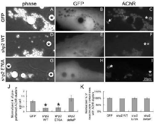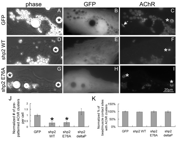 Figure 7. Acceleration in the dispersal of pre-patterned AChR clusters resulting from exogenous wild-type or constitutively active Shp2 expression. R-BTX labeled muscle cells expressing GFP only (A-C), or GFP plus Shp2 WT (D-F), Shp2 E76A (E-G) or Shp2 deltaP (not shown) were stimulated overnight with HB-GAM beads. In a fraction of bead-stimulated cells expressing GFP alone, pre-patterned AChR clusters were still present, but the fraction of such cells expressing wild-type or active Shp2 that retained pre-patterned clusters was significantly lower. To quantify these results, the number of pre-patterned clusters counted in bead-stimulated cells was divided by the number obtained from muscle cells that had not been exposed to beads (to offset differences in pre-patterned cluster formation; see text). Results normalized relative to GFP-cells are shown in panel J. GFP-cells, n = 212; Shp2 WT, n = 60; Shp2 E76A, n = 138; Shp2 deltaP, n = 127; *p < 0.01; **p < 0.05. Panel K shows that the expression of Shp2 proteins did not affect bead-induced AChR clustering.