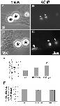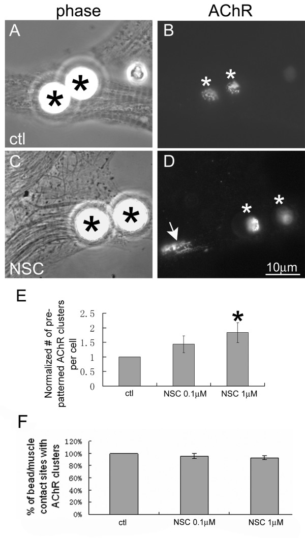 Figure 4. Inhibition of HB-GAM bead-induced dispersal of pre-patterned AChR clusters by NSC-87877. R-BTX-labeled muscle cells were stimulated overnight with HB-GAM beads in the absence (A, B) or presence of 1 μM NSC-87877 (C, D). In control cells only bead-induced AChR clusters were present (B; asterisks) but in the NSC-treated cells both bead-induced (D; asterisks) and pre-patterned AChR clusters (arrows) were detected. The number of pre-patterned AChR clusters in bead-stimulated cells and the fraction of beads that induced new AChR clusters were quantified from multiple experiments using 0.1 or 1 μM NSC and the results were normalized relative to cells maintained in control medium (E, F). NSC-treatment inhibited the dispersal of pre-patterned AChR clusters but did not significantly affect the induction of new AChR clusters by HB-GAM beads. Control, n = 95; 0.1 μM NSC, n = 115; 1 μM NSC, n = 129; *p < 0.05, 1 μM NSC relative to control.