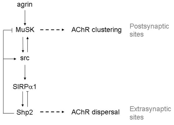 Figure 9. A model for Shp2-dependent regulation of AChR redistribution. Synaptogenic stimuli initiate two SIRPα1/Shp2-involving signaling cascades. Agrin/MuSK stimulates src family tyrosine kinases that, in addition to phosphorylating MuSK, phosphorylate SIRPα1 to activate Shp2, which then dephosphorylates (on tyr527) and stimulates more src, and thus more SIRPα1/Shp2, etc., to propagate the dispersal signal that disassembles pre-patterned AChR clusters at extrasynaptic sites. Locally at postsynaptic sites, SIRPα1/Shp2 signaling triggered by MuSK/src acts through a feedback loop to restrain the MuSK-initiated AChR clustering signal, which helps generate new AChR clusters selectively at postsynaptic sites. This form of regenerative signaling through src, SIRPα1 and Shp2 also has built-in self-regulation because Shp2 can dephosphorylate SIRPα1 to control its own activation state.